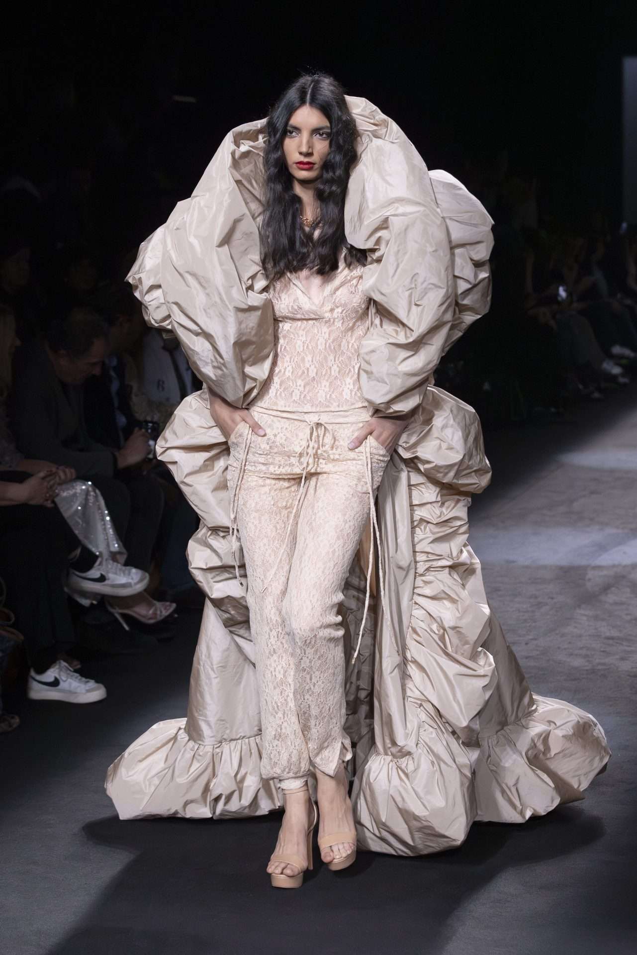 Las siluetas incluyen túnicas y abrigos envolventes, pantalones de corte setentero, maxi blusas y vestidos rectos con acentos art decó. Los tejidos y materiales —cuero, encaje con plisado soleil, terciopelo y gasas de seda— fluyen en composiciones refinadas, enriquecidas con bordados ornamentales realizados a mano.