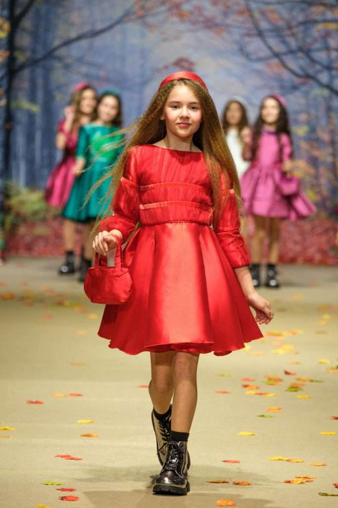 En esta edición, Javilar Kids presentó su colección “Jardines de Invierno”, una propuesta que reinterpreta el romanticismo clásico desde una visión contemporánea y artesanal. La firma apuesta por una paleta cromática que incorpora verdes, púrpuras y frambuesas junto a tonos suaves, trabajando tejidos nobles como mikado, tafeta y organza. Los detalles en sedas pintadas a mano y terciopelo aportan singularidad a diseños que combinan estructura moderna y tradición.