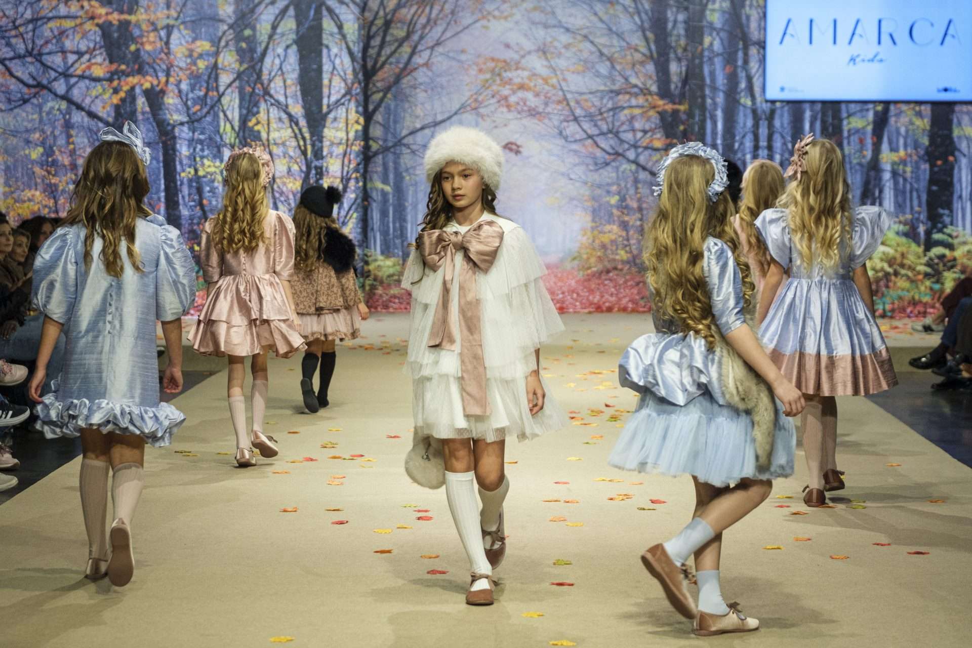 Por su parte, Amarca Kids presentó “Ecos de Palacio”, una colección que evoca un universo delicado y elegante, donde la estética etérea y los acabados artesanales cobran protagonismo. Vestidos ligeros elaborados con tules y bordados sutiles se desarrollan en una gama de rosas empolvados, azules hielo y grises mármol, configurando una propuesta que pone en valor la sensibilidad creativa y el cuidado por el detalle.